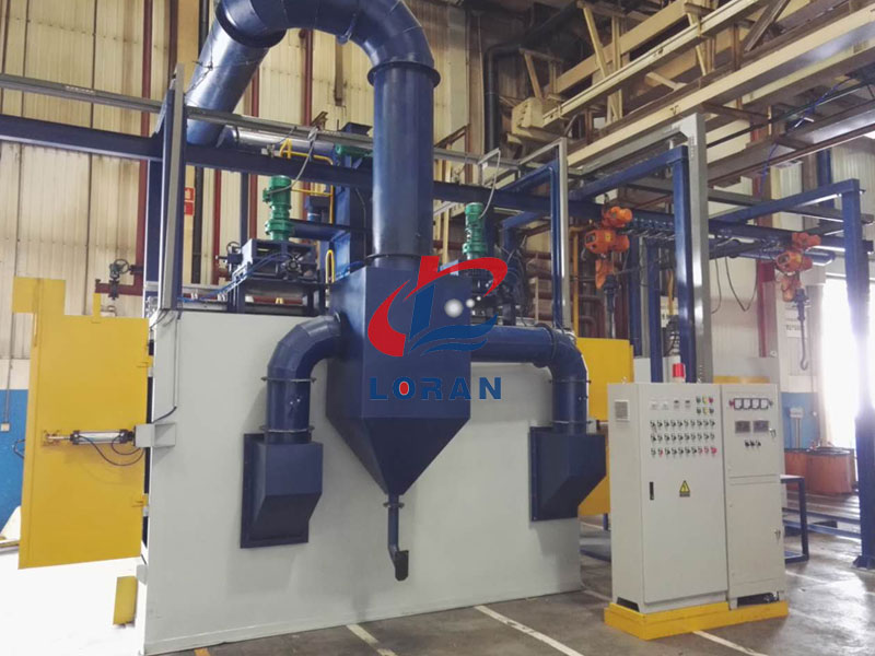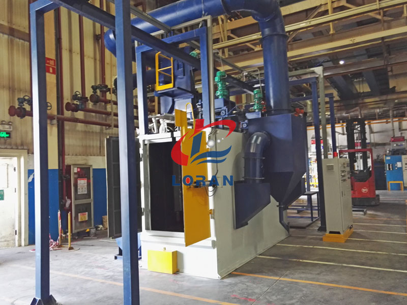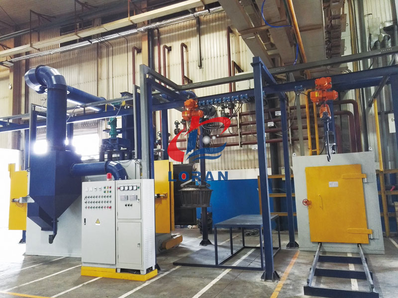 采用无地坑形式,特殊的吊钩设计和行走旋转驱动机构,尤其适用于复杂形状铸件的落砂和焊接结构件的去除氧化皮,其效果超群。